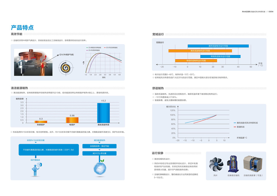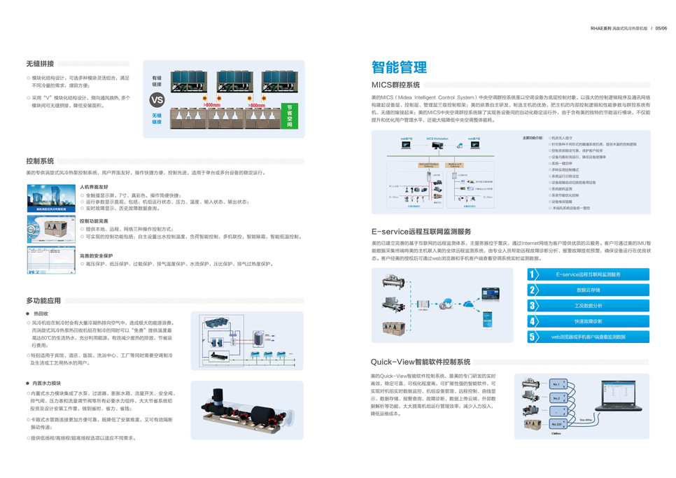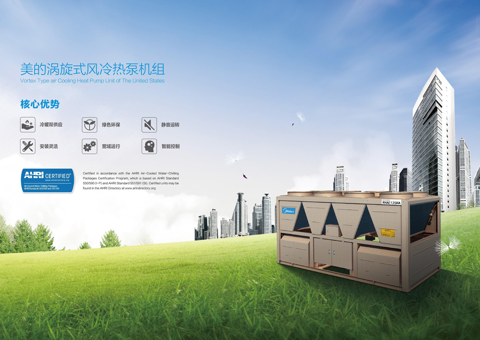 產(chǎn)品描述:風(fēng)冷熱泵機(jī)組是以空為冷熱源,水為傳熱介質(zhì)的中央空調(diào)機(jī)組,采用清潔能源制熱,代替?zhèn)鹘y(tǒng)燃煤鍋爐,實現(xiàn)夏季制冷、冬季采暖。美的RHAE系列R410A渦旋式風(fēng)冷熱泵機(jī)組采用模塊化設(shè)計,基準(zhǔn)模塊包括330kW、440kW,最多模塊化8臺,最大冷量440*8=3720kW,形成330kW~3720kW范圍內(nèi)的組合產(chǎn)品。該機(jī)組廣泛適用于星級酒店、賓館、醫(yī)院、辦公樓等各類建筑。
